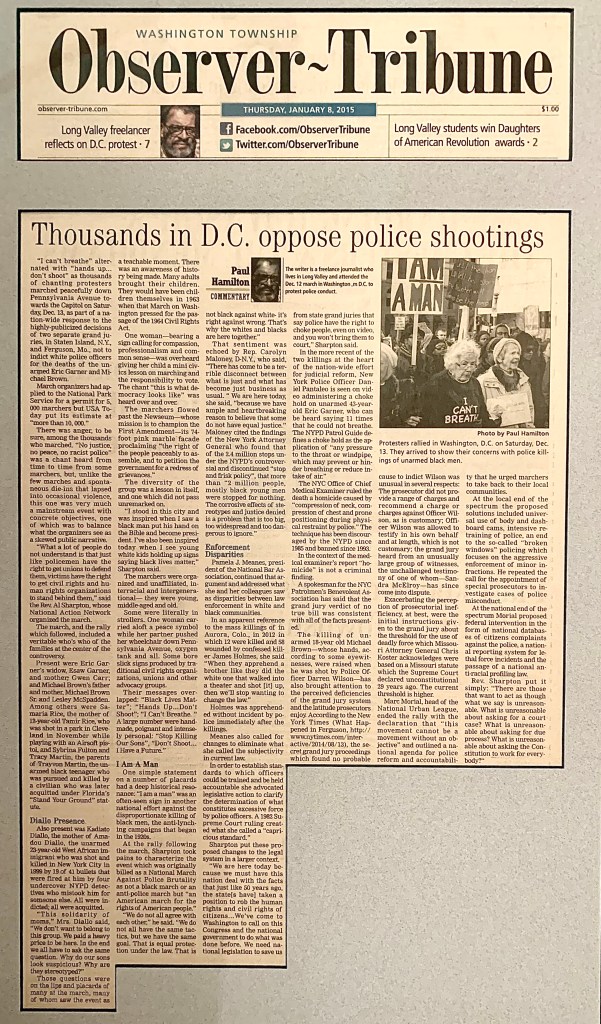 “I can’t breathe” alternated with “hands up, don’t shoot” as thousands of chanting protesters marched peacefully down Pennsylvania Avenue.”