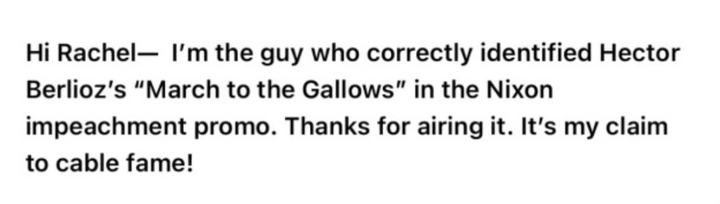 Rachel Maddow updates an earlier segment on the music used by NBC News during the introduction of the Nixon impeachment hearings with additional information submitted in real time from viewers that the music comes from Hector Berlioz’s Symphonie Fantastique. https://www.msnbc.com/rachel-maddow/watch/name-that-tune-trms-historic-impeachment-soundtrack-edition-73374277605 Source: MSNBC.com