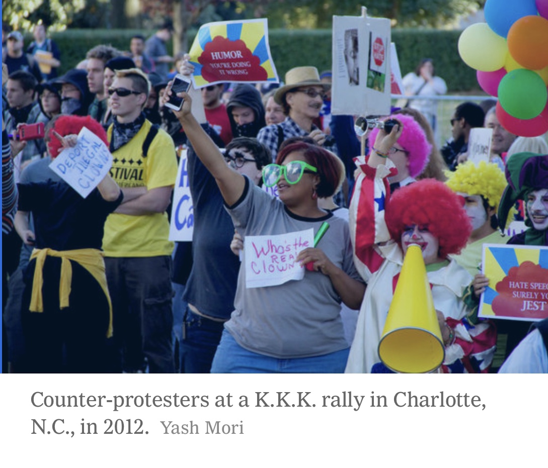 By undercutting the gravitas white supremacists are trying to accrue, humorous counterprotests may blunt the events’ usefulness for recruitment. Brawling with bandanna-clad antifas may seem romantic to some disaffected young men, but being mocked by clowns? Probably not so much.”
