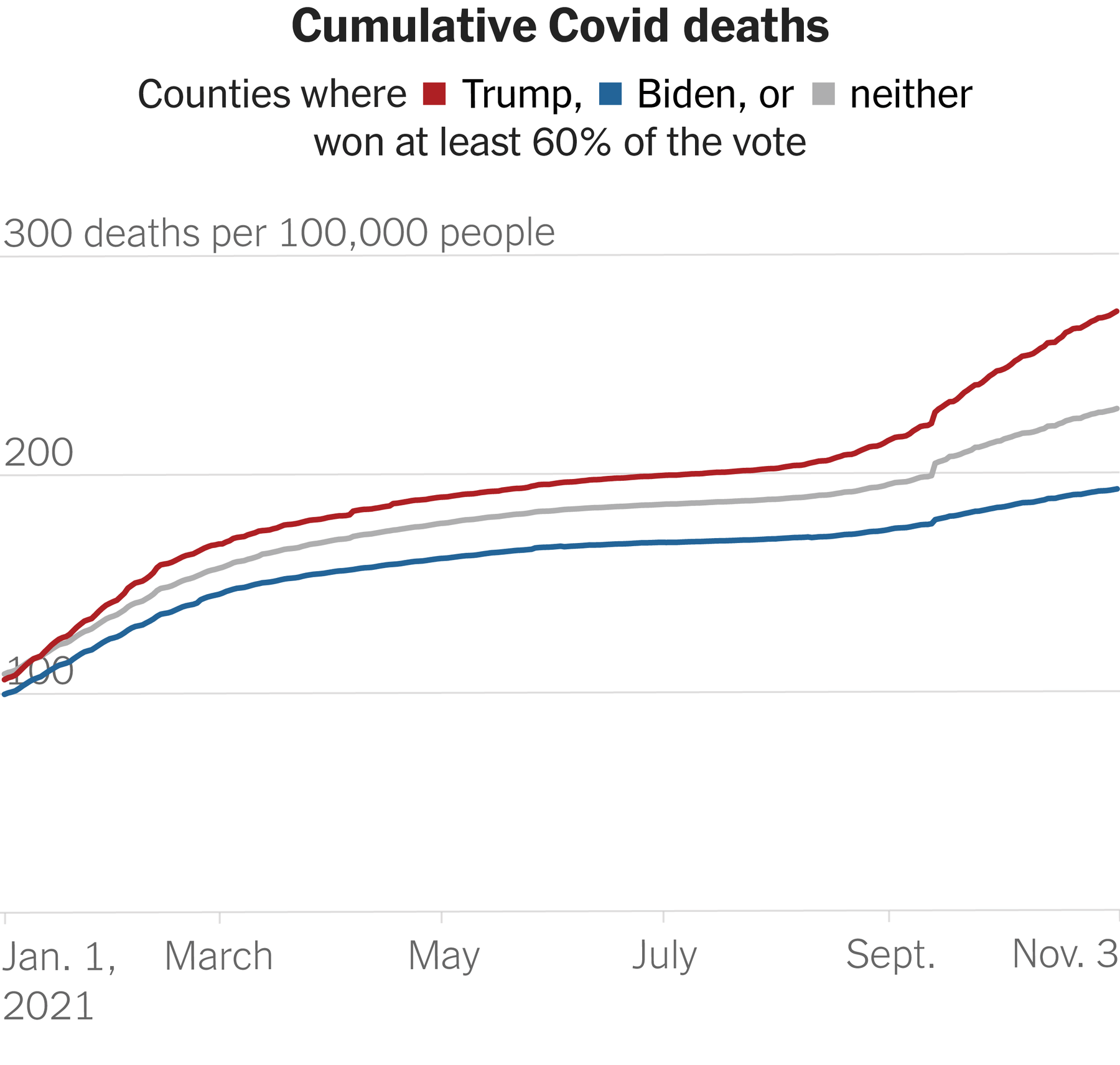 In October, 25 out of every 100,000 residents of heavily Trump counties died from Covid, more than three times higher than the rate in heavily Biden counties (7.8 per 100,000). October was the fifth consecutive month that the percentage gap between the death rates in Trump counties and Biden counties widened.