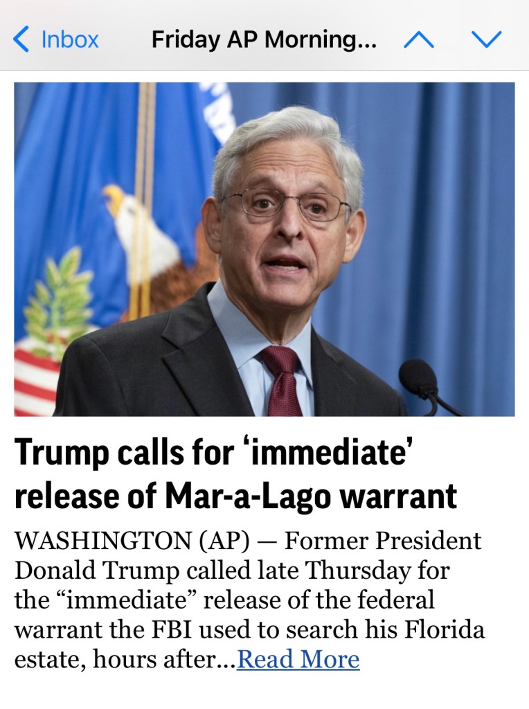 A) “Former President Donald Trump called late Thursday for the “immediate” release of the federal warrant the FBI used to search his Florida estate, hours after the Justice Department had asked a court to unseal the warrant, with Attorney General Merrick Garland citing the ‘substantial public interest in this matter….’”