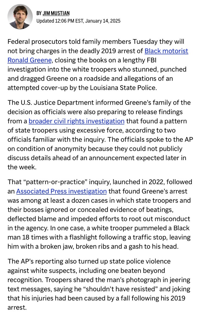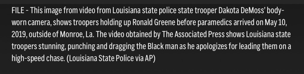 https://apnews.com/article/ronald-greene-civil-rights-louisiana-police-investigation-7d24667bc1e1162b420f16fa7e780cae 5/10/24: https://apnews.com/article/police-brutality-louisiana-ronald-greene-race-civil-rights-4446d9b069803545247c610882951763