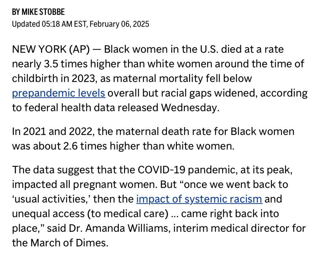 How soon before the CDC scrubs “systemic racism?” https://apnews.com/article/maternal-mortality-deaths-black-white-1755a7d1b51d2098326fd651af9bb1ef