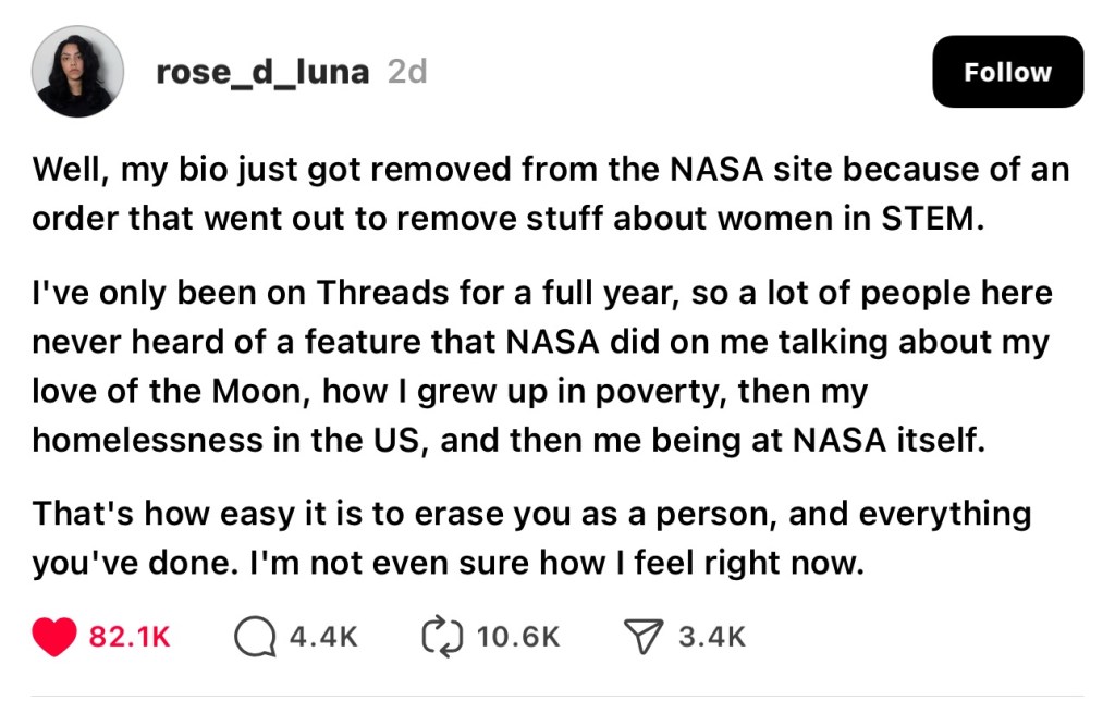 Profile scrubbed from NASA site Read it here: https://web.archive.org/web/20231206220911/https://www.nasa.gov/universe/nasa-intern-found-hope-in-the-moon-2/ Keep hope alive.
