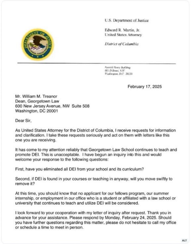 In an extraordinary letter sent to the dean of Georgetown law school, the recently appointed interim US attorney for the District of Columbia, Ed Martin, said he was investigating the academic institution after it had come to his “attention reliably” that they were teaching and promoting DEI.