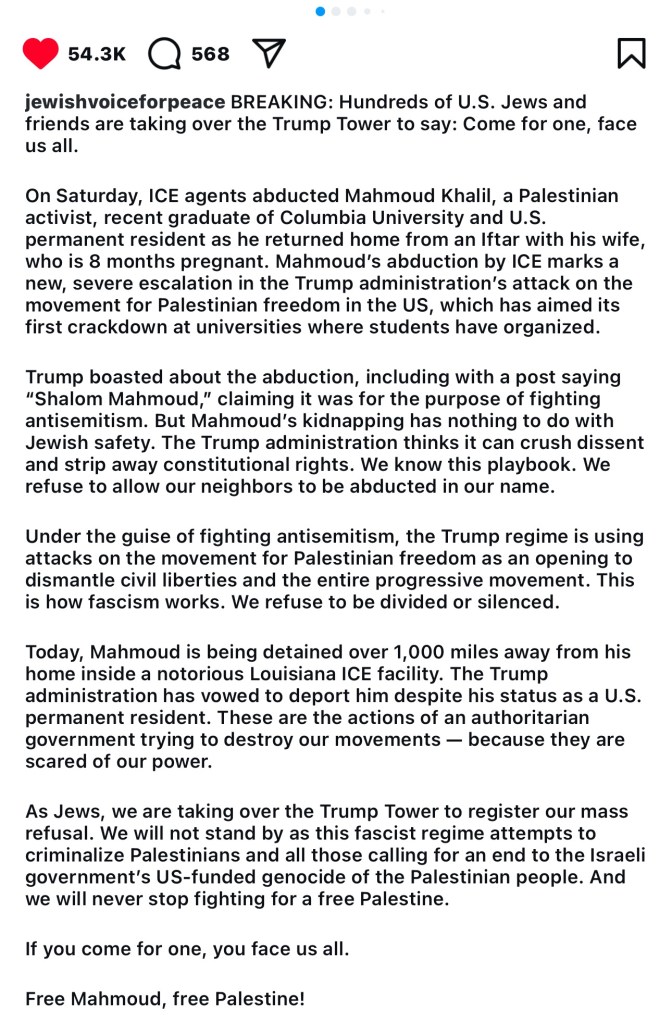 “As Jews, we are taking over the Trump Tower to register our mass refusal,” JVP says in a statement.