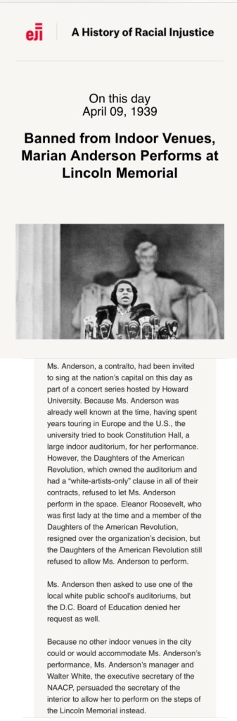 Marian Anderson performs outdoors at Lincoln Memorial when racist “whites only” policy prevented the internationally-acclaimed singer from performing indoors at Constitution Hall.