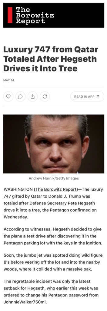 Luxury 747 from Qatar Totaled After Hegseth Drives it Into a Tree
