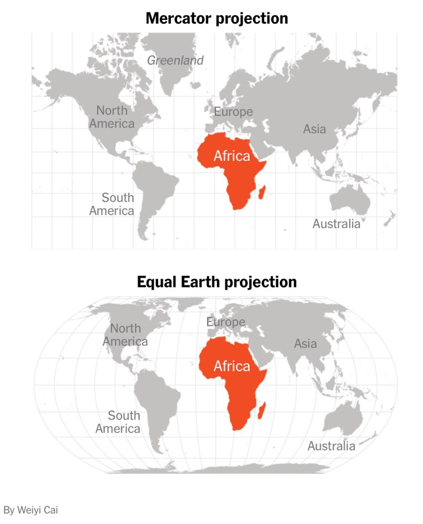Last week, the African Union, a continental group of 55 countries, endorsed a campaign to have organizations around the world replace the Mercator map with alternatives such as the 2018 Equal Earth projection, which supporters say more accurately reflects the true size of Africa.